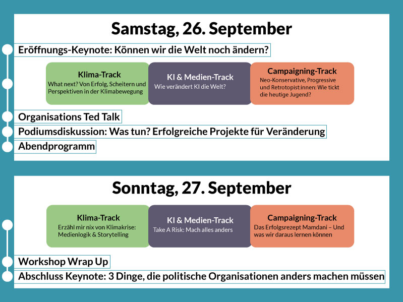 Am Zukunftsforum gibt es parallel drei inhaltliche Tracks: Klima, KI & Medien und Campaigning. Du kannst dich nach der Zusage für einen der drei Tracks entscheiden und nimmst dann an beiden Tagen an den Workshops vom jeweiligen Track teil. Mehr Details zu Workshops + Tracks findest du im Programm.
